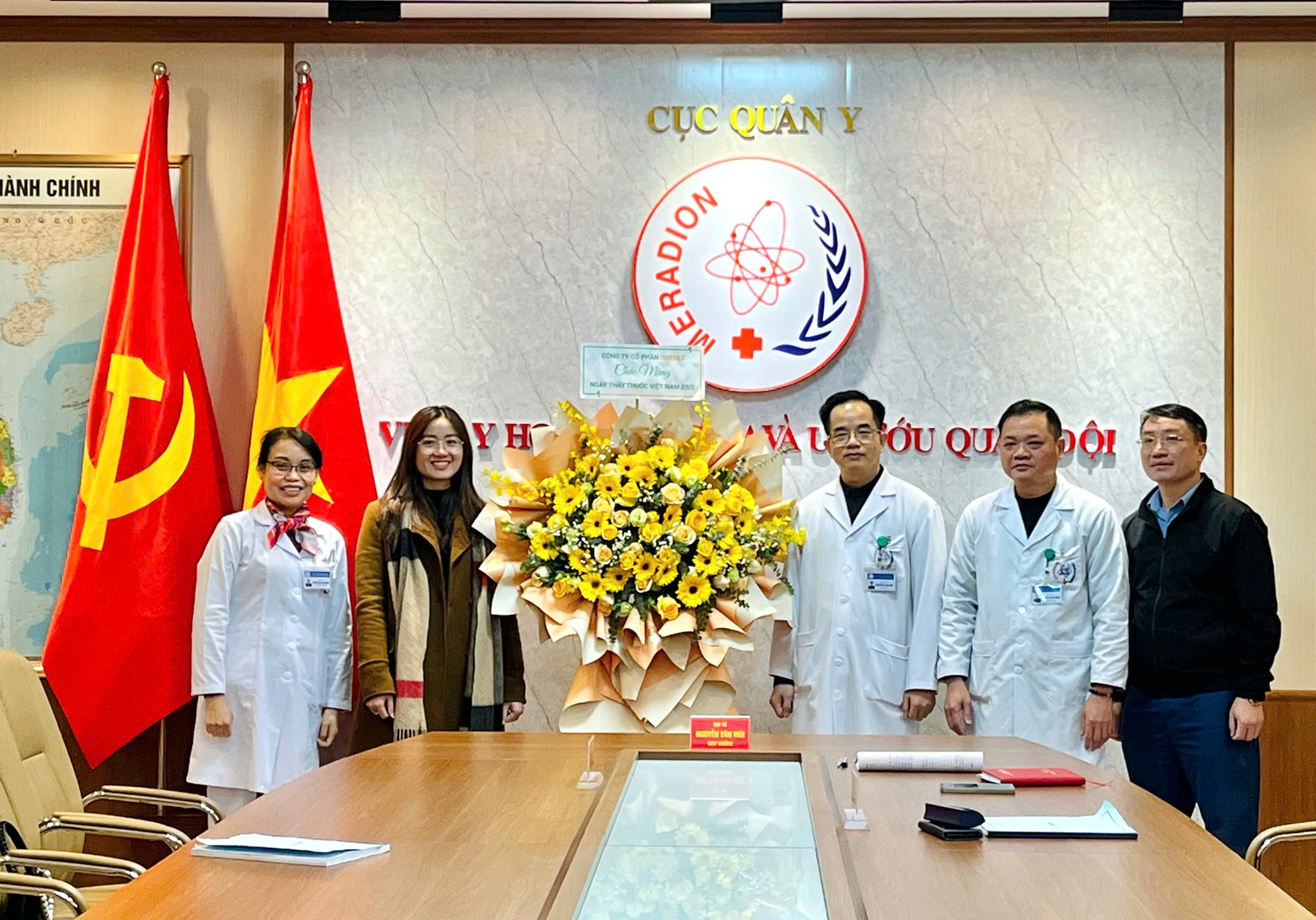 Đại diện ONENET trực tiếp đến tặng hoa chúc mừng Viện Y học Phóng xạ và U Bướu Quân đội. Đại tá, Viện trưởng Nguyễn Văn Mùi cùng đội ngũ Ban Lãnh đạo Viện gửi lời cảm ơn và chụp ảnh lưu niệm cùng ONENET.